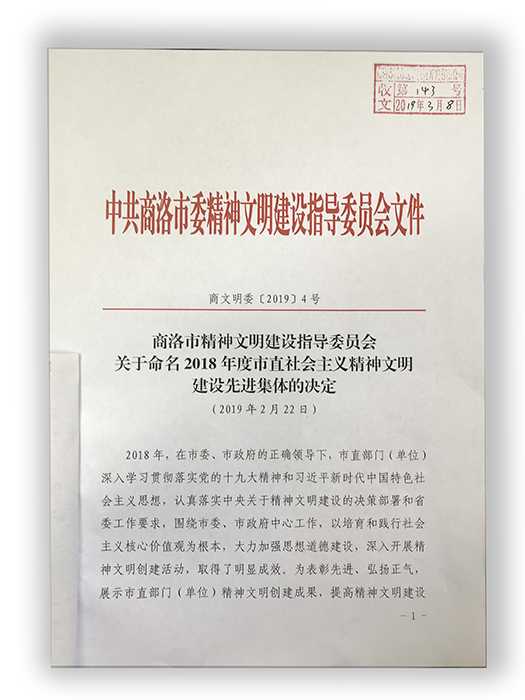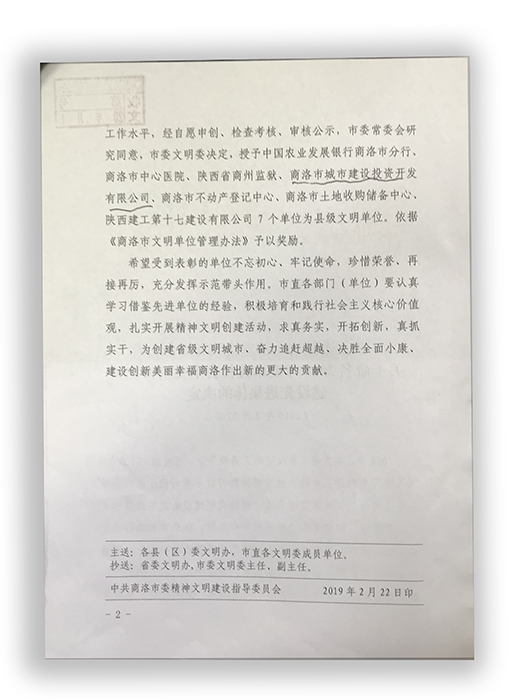 2018年,市城投公司在市委、市政府的正確領(lǐng)導(dǎo)下,深入學(xué)習(xí)貫徹落實(shí)黨的十九大精神和習(xí)近平新時(shí)代中國(guó)特色社會(huì)主義思想,認(rèn)真落實(shí)中央關(guān)于精神文明建設(shè)的決策部署和省市委工作要求,以培育和踐行社會(huì)主義核心價(jià)值觀為根本,大力加強(qiáng)思想道德建設(shè),深入開(kāi)展精神文明創(chuàng)建各項(xiàng)活動(dòng),取得了顯著成效。經(jīng)扎實(shí)開(kāi)展創(chuàng)建活動(dòng),自查和市文明委檢查考核、審核公示,報(bào)經(jīng)市委常委會(huì)研究同意,市委文明委授予商洛市城市建設(shè)投資開(kāi)發(fā)有限公司縣級(jí)文明單位稱(chēng)號(hào)。