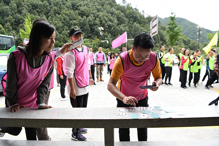 19日上午,全體黨員、員工首先乘車(chē)來(lái)到終南山拓展基地,集體參加了“凝心聚力”拓展訓(xùn)練。53名學(xué)員分別組成雲(yún)漢隊(duì)和雄鷹隊(duì),兩隊(duì)集思廣益,各自形成隊(duì)名、隊(duì)旗、口號(hào)及隊(duì)歌并一一展示。在“達(dá)芬奇密碼”拓展項(xiàng)目中,大家充分發(fā)揮團(tuán)隊(duì)力量,隊(duì)友間相互信任、不斷嘗試、在反復(fù)摸索和密切協(xié)作下,最終雄鷹隊(duì)以3比2獲勝。充分展現(xiàn)了城投人永不言棄、進(jìn)無(wú)止境的團(tuán)隊(duì)精神。